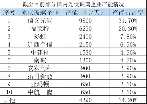 信義光能作為全球光伏玻璃龍頭,市占率多年保持在第一位。該公司是全球領(lǐng)先的太陽(yáng)能光伏玻璃制造商,專業(yè)從事太陽(yáng)能光伏玻璃的研發(fā)、制造、銷售和售后服務(wù)的大型公司,提供太陽(yáng)能光伏玻璃和薄膜導(dǎo)電玻璃完整的產(chǎn)品解決方案。信義光能共擁有六大生產(chǎn)基地,目前已擁有總計(jì)日熔化量13800噸的太陽(yáng)能光伏玻璃生產(chǎn)線,主要產(chǎn)品涵蓋太陽(yáng)能光伏玻璃、背板玻璃。