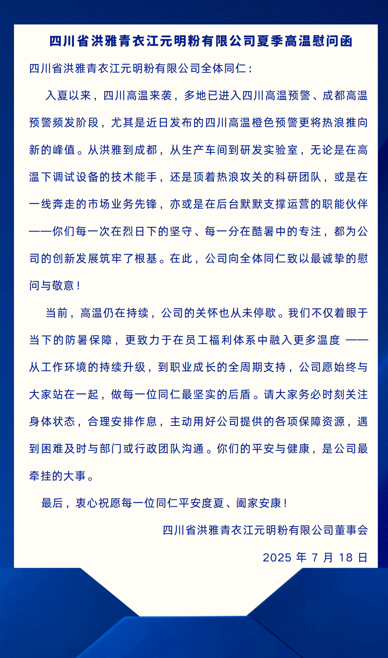 四川省洪雅青衣江元明粉有限公司夏季高溫慰問函